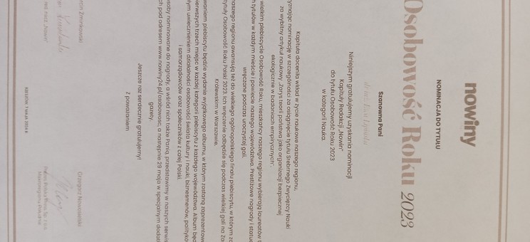 w imieniu Marcina Żminkowskiego, p.o. Redaktora Naczelnego „Nowin” mam przyjemność poinformować o przyznaniu Pani przez Kapitułę Redakcji nominacji do tytułu Osobowość Roku 2023 w kategorii Nauka.