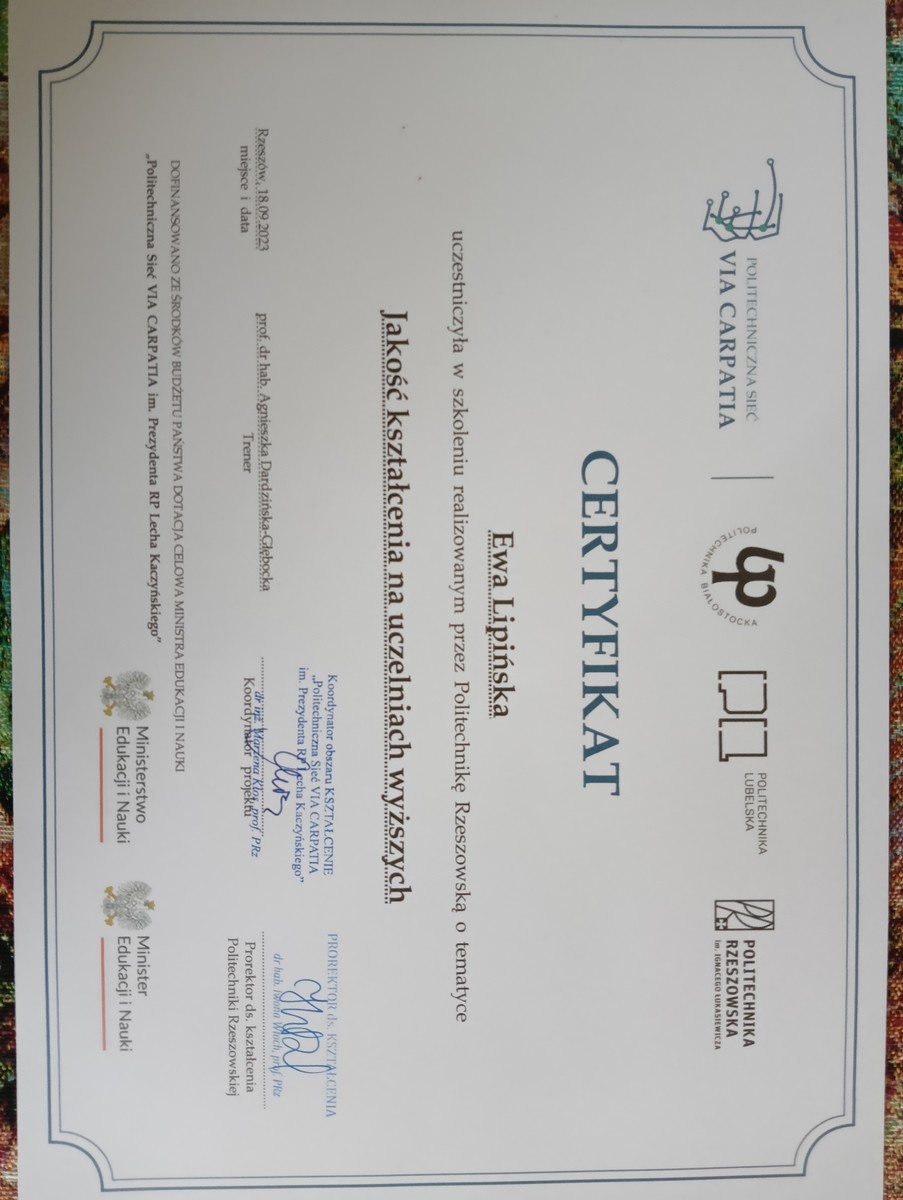 - Certyfikat "Metody i techniki kształcenia na odległość" 2023