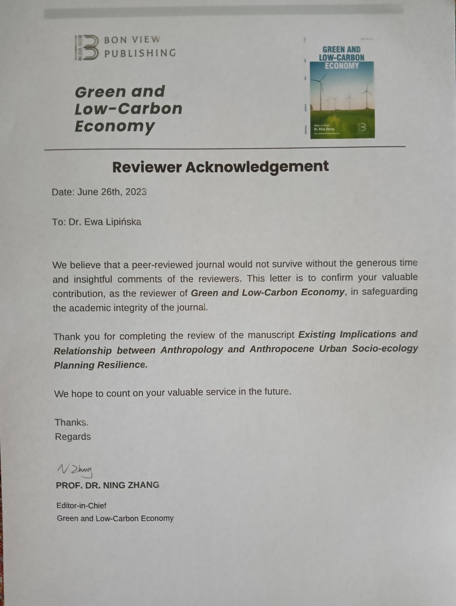Wierzymy, że recenzowane czasopismo nie przetrwałoby bez hojności czasu i wnikliwych komentarzy recenzentów. Niniejszy list ma na celu potwierdzenie Twojego cennego wkładu, jako recenzenta "Green and Low-Carbon Economy", w ochronę integralności akademickiej czasopisma.