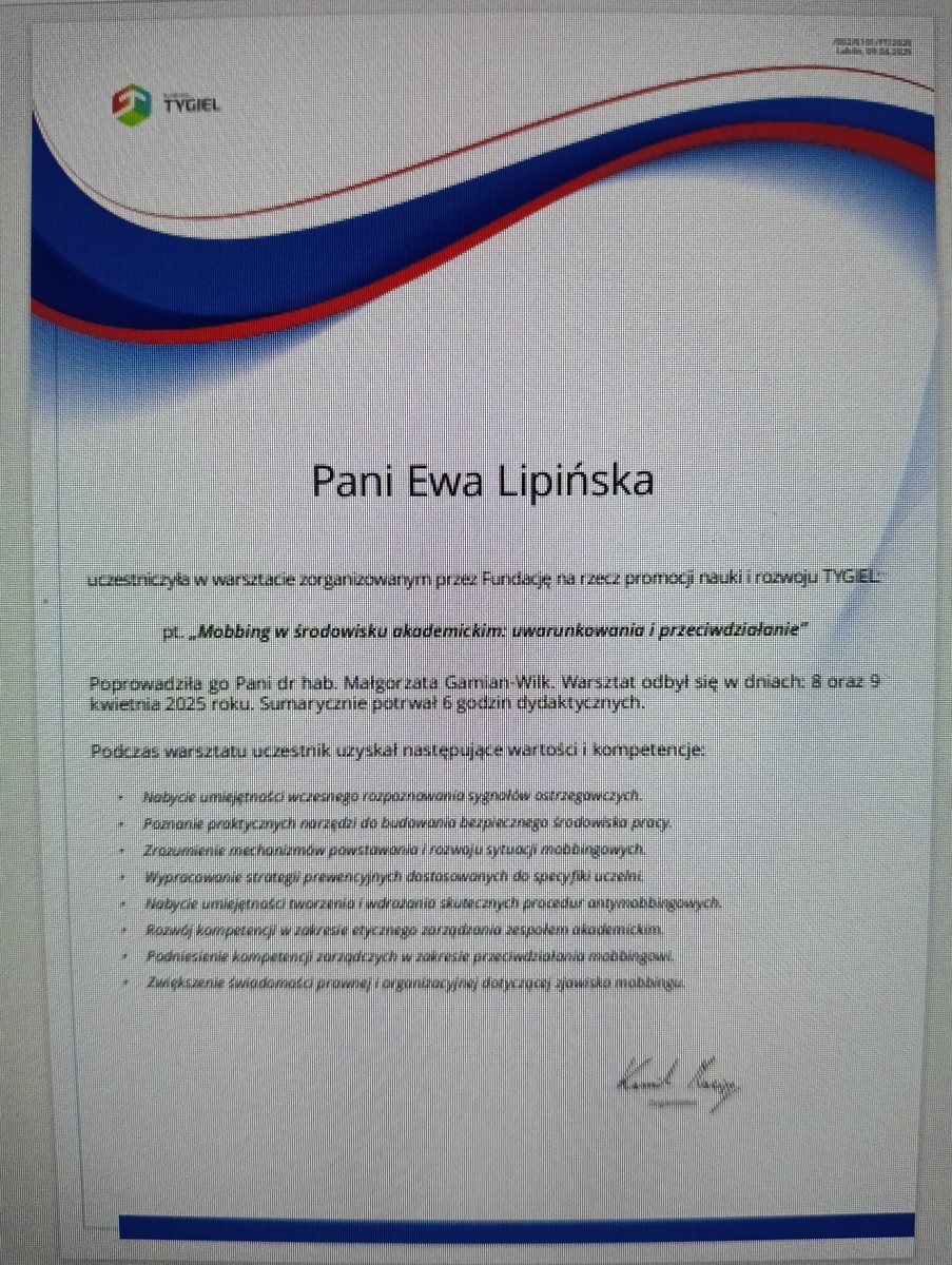 Certyfikat „Mobbing w środowisku akademickim: uwarunkowania i przeciwdziałanie" 8-9.04.2025 r.